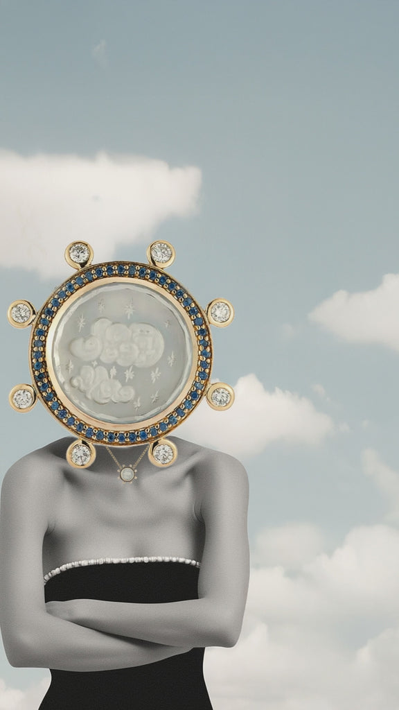Whimsical clouds and stars are hand carved on the reverse of this faceted rock crystal, backed with mother-of-pearl and bordered by sapphires and diamonds.